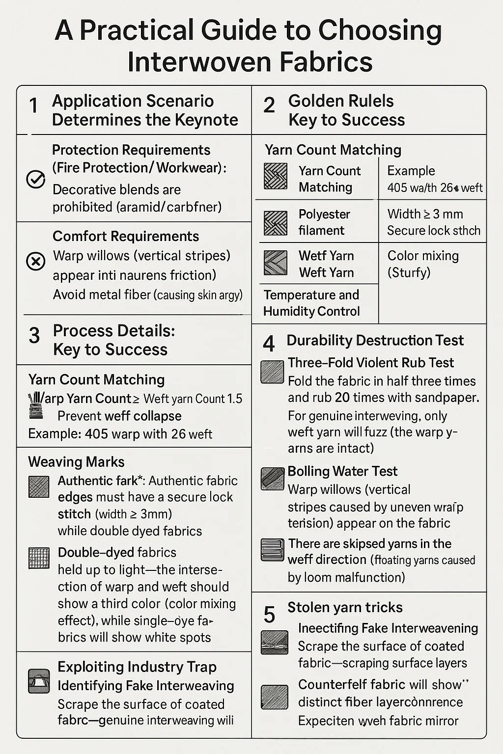 সুরক্ষার প্রয়োজনীয়তা (আগুন সুরক্ষা/ওয়ার্কওয়্যার): ওয়ার্প সুতা অবশ্যই উচ্চ-শক্তির ফাইবার (অ্যারামিড/কার্বন ফাইবার) হতে হবে। আলংকারিক মিশ্রণ নিষিদ্ধ (কমানো সুরক্ষা স্তর)।