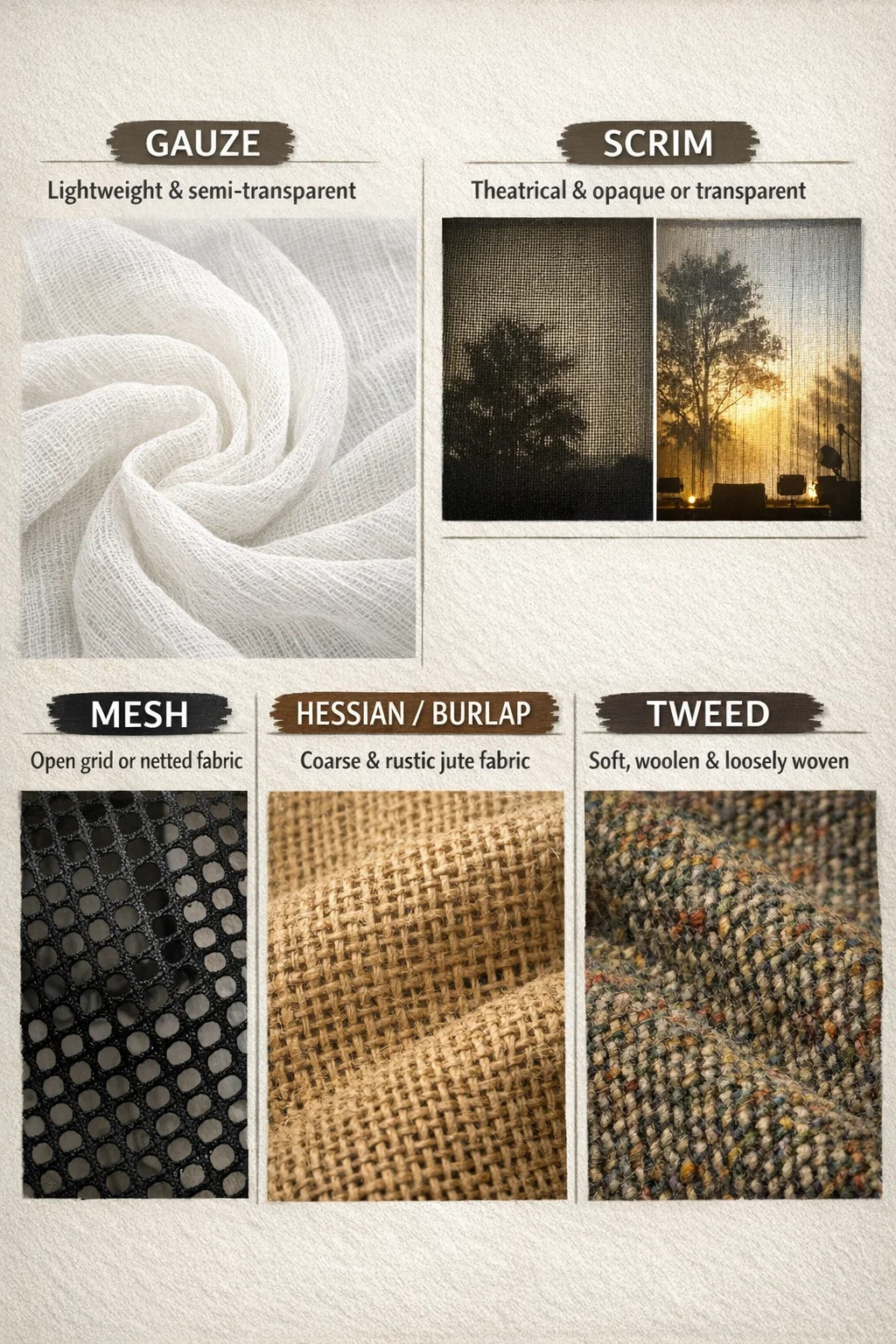 কাঠামোগত বৈশিষ্ট্য: এই ফ্যাব্রিকের পাটা এবং ওয়েফট থ্রেডের মধ্যে বড় ফাঁক রয়েছে, যা এটিকে আধা-স্বচ্ছ এবং খুব হালকা করে তোলে।