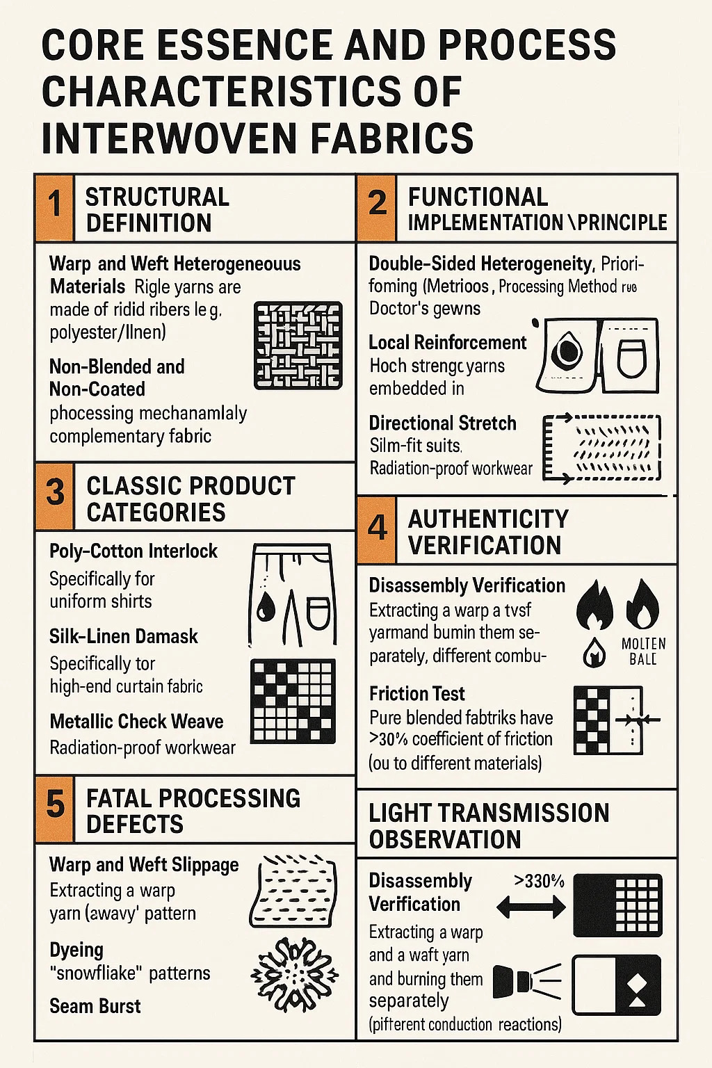 বিচ্ছিন্নকরণ যাচাই: একটি ওয়ার্প সুতা এবং একটি ওয়েফ্ট সুতা বের করুন এবং আলাদাভাবে পোড়ান - খাঁটি আন্তঃবোনা কাপড়গুলি বিভিন্ন জ্বলন প্রতিক্রিয়া প্রদর্শন করবে (যেমন, তুলো ওয়েফট অ্যাশ/পলিয়েস্টার ওয়ার্প গলিত বল)।