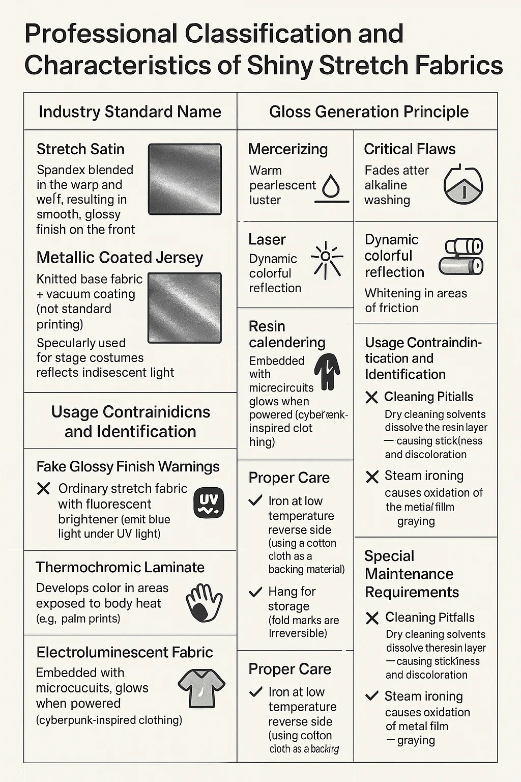 জাল চকচকে ফিনিশ সতর্কতা: ফ্লুরোসেন্ট ব্রাইটনার সহ সাধারণ স্ট্রেচ ফ্যাব্রিক (UV আলোর অধীনে নীল আলো নির্গত করে) নিম্নমানের PVC আবরণ (ভাঁজ করলে স্থায়ী সাদা দাগ ফেলে)