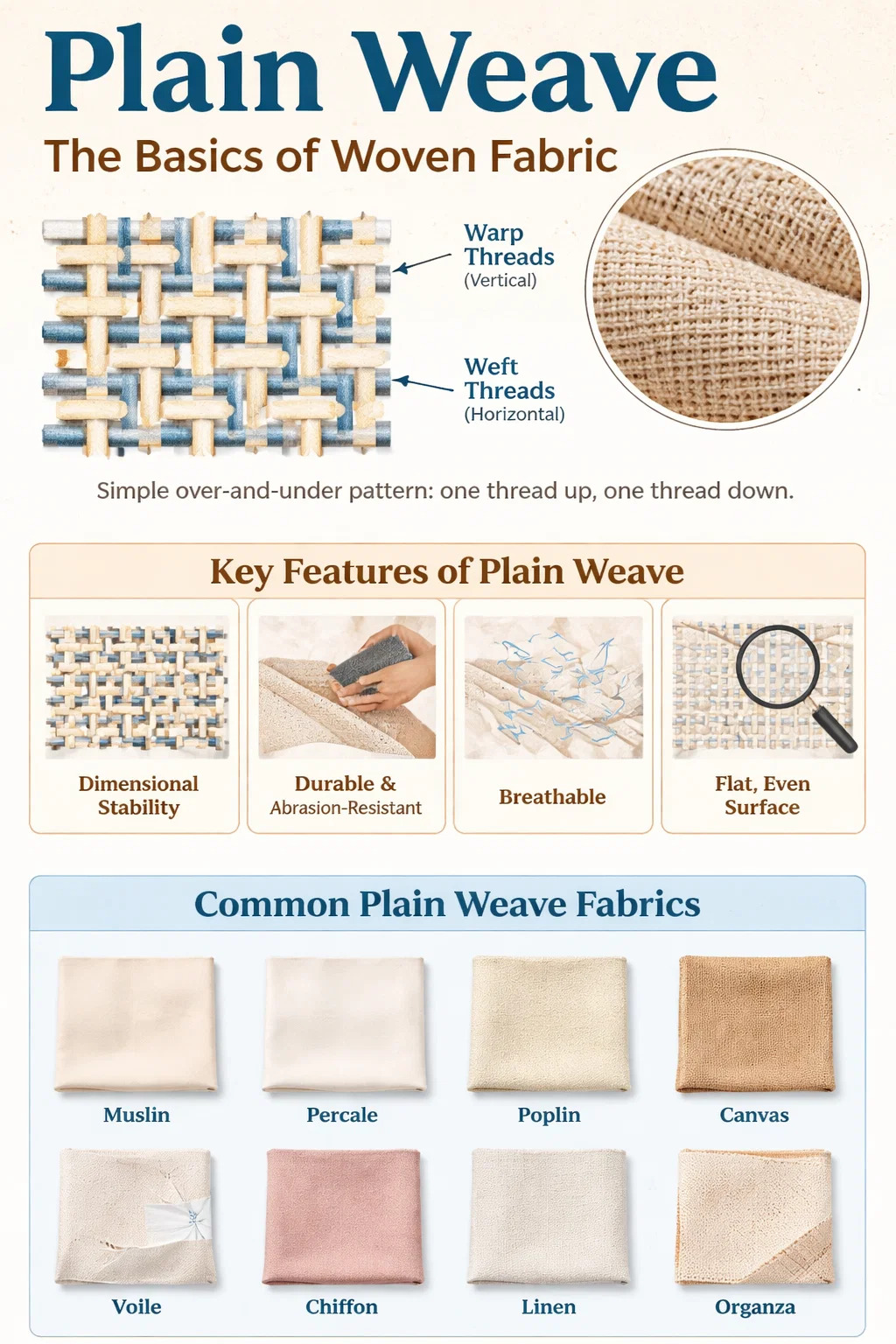 প্লেইন ওয়েভ কোনো একক ফ্যাব্রিক নয়—এটি একটি স্ট্রাকচারাল ক্যাটাগরি যা শত শত আলাদা ফ্যাব্রিকের নাম ধারণ করে। তাদের মধ্যে পার্থক্যগুলি ফাইবার সামগ্রী, সুতার সংখ্যা, সুতার ঘনত্ব এবং ফিনিশিং ট্রিটমেন্ট থেকে উদ্ভূত হয় বরং বুনাতে যে কোনও পরিবর্তনের কারণে।