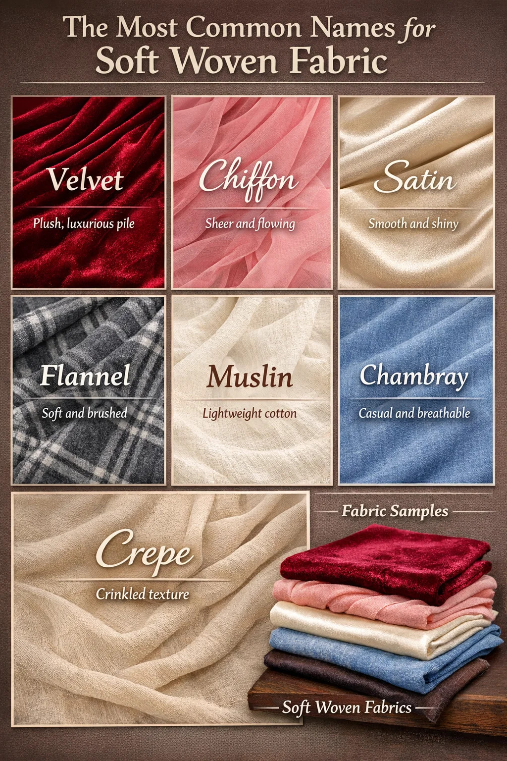 যখন লোকেরা জিজ্ঞাসা করে "নরম বোনা কাপড়ের নাম কী," উত্তরটি ফাইবার সামগ্রী, বুনা কাঠামো এবং ফিনিশের উপর নির্ভর করে। সবচেয়ে ব্যাপকভাবে স্বীকৃত নরম বোনা কাপড় অন্তর্ভুক্ত মখমল, শিফন, সাটিন, মসলিন, ফ্ল্যানেল, চেম্ব্রে এবং ক্রেপ . এগুলির প্রত্যেকটি একটি তাঁতে আবদ্ধ সুতো ব্যবহার করে উত্পাদিত হয়, তবুও সুতাগুলিকে কীভাবে সাজানো, পাকানো বা বুননের পরে শেষ করা হয় তার কারণে এগুলি একে অপরের থেকে সম্পূর্ণ আলাদা বোধ করে।